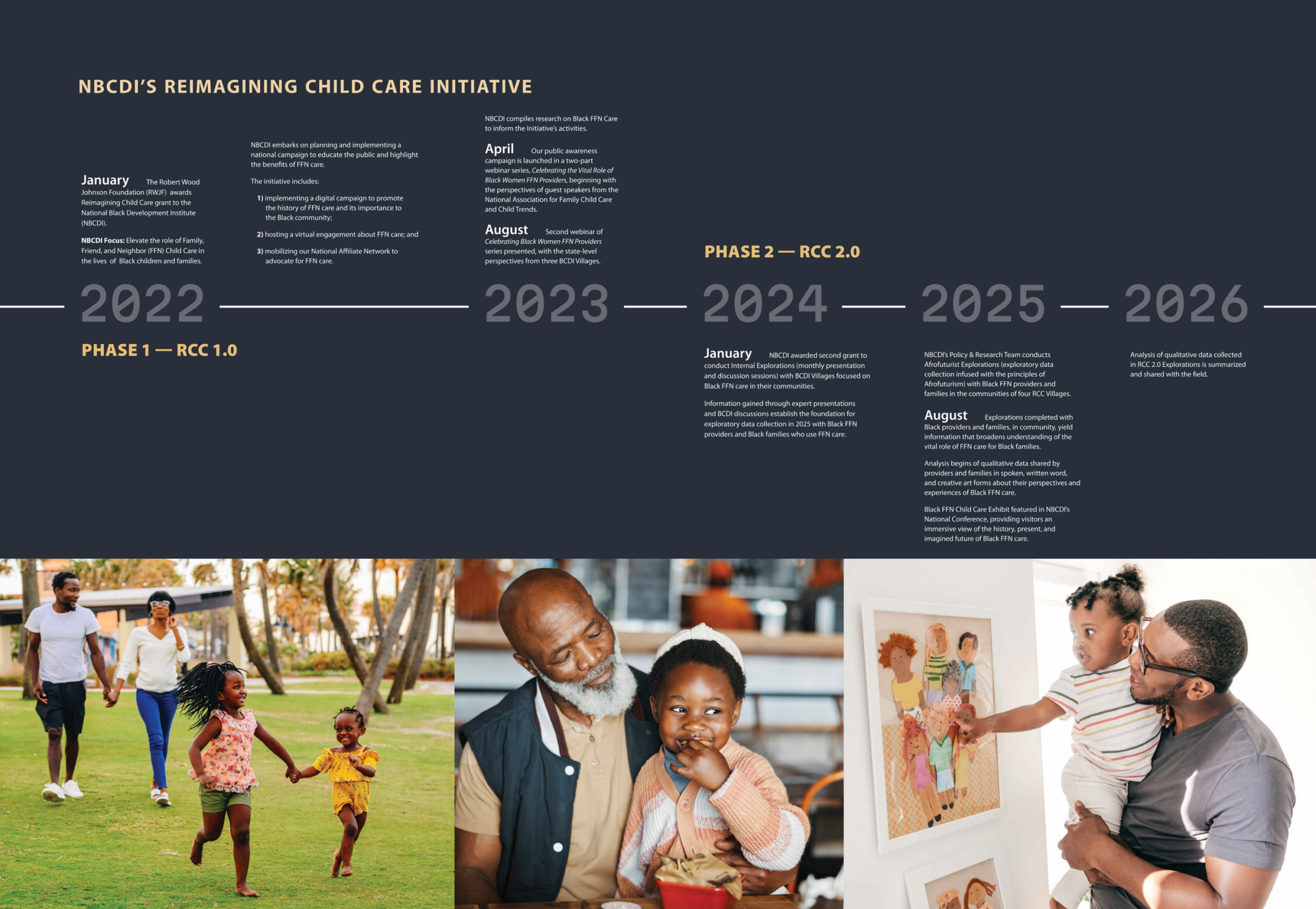 FFN care encompasses a spectrum of caregivers — from family like grandmothers and grandfathers to family friends and neighbors who have grown to be family like community aunties—all who share a genuine love in caring for the futures, joy, and brilliance of our children. Despite being the most common form of non-parental child care in the U.S., the body of research on FFN care in general is limited and particularly sparse on Black FFN care. NBCDI’s Reimagining Child Care (RCC) Initiative is an exploratory community project funded by the Robert Wood Johnson Foundation to fill this gap through narrative and storytelling that uses a community centered initiative to inform policy and strengthen advocacy.